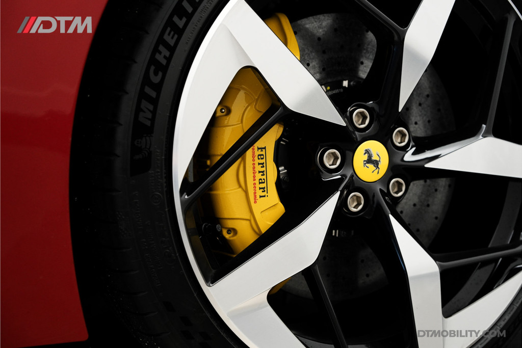 Dit exemplaar is met buitengewoon veel smaak samengesteld. De klassieke rode lakkleur (Classic Colours Rosso) vormt een spectaculair contrast met de Two-Tone Nero carrosseriedelen en de hoogglans zwarte velgen met titanium wielbouten. Gele remklauwen en de iconische 'Scuderia Ferrari' schilden maken het uiterlijk perfect af.