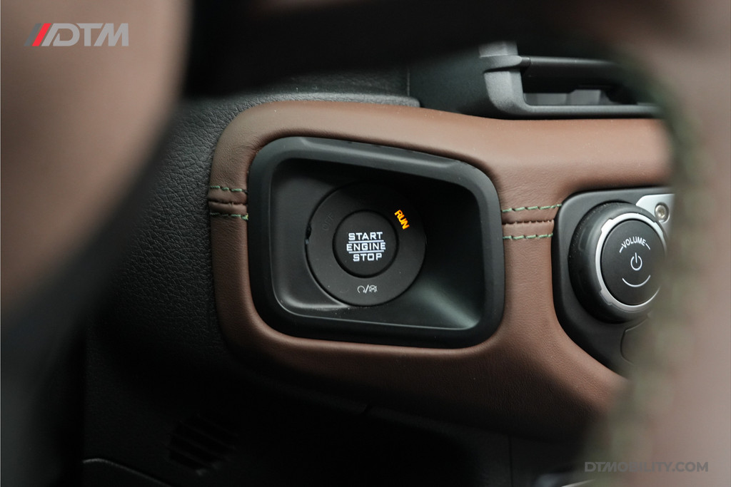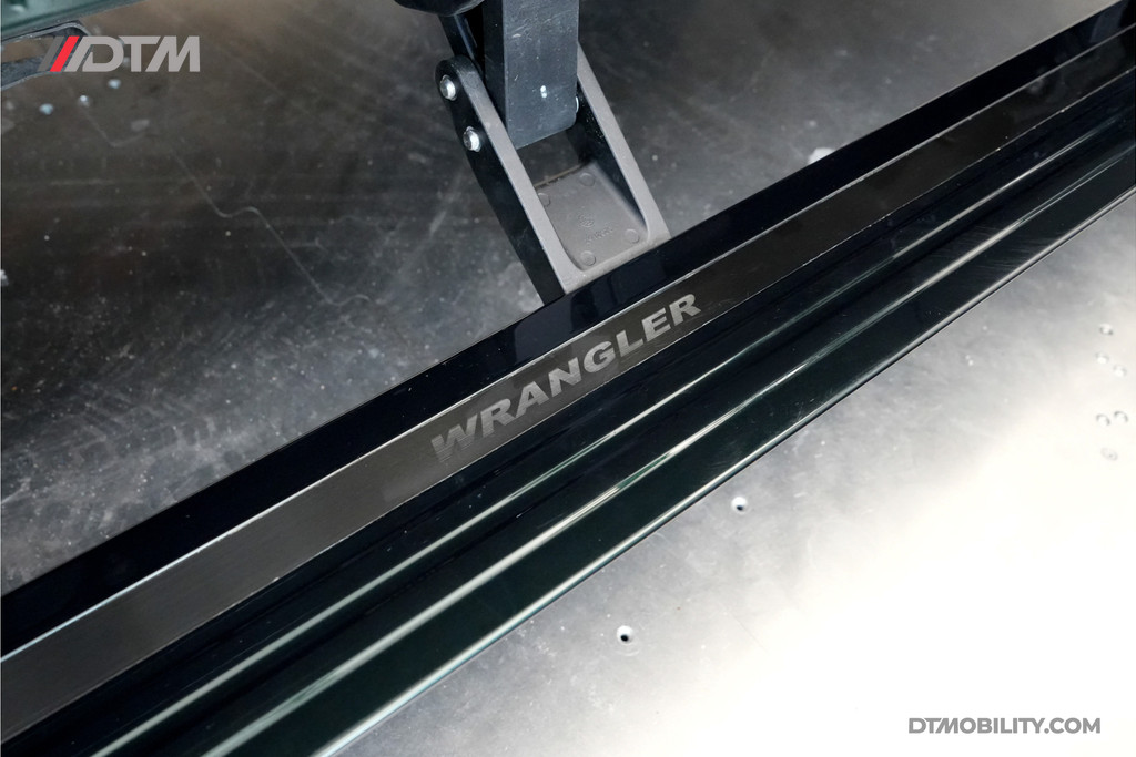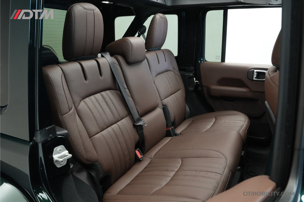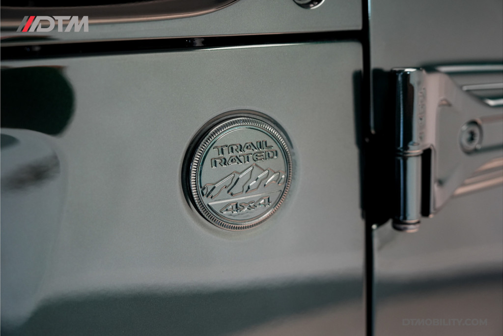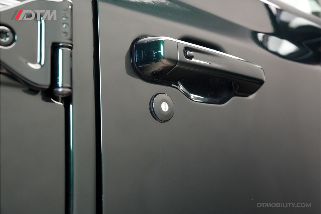 De eerste aanblik laat geen ruimte voor twijfel: dit is pure klasse. De carrosserie is volledig uitgevoerd in de iconische Porsche-kleur Emerald Green (Paint to Sample). Deze diepe, rijke groentint geeft de Jeep een tijdloze elegantie, tot in de kleinste details doorgevoerd (inclusief de instaplijsten en binnenzijde van de stijlen).