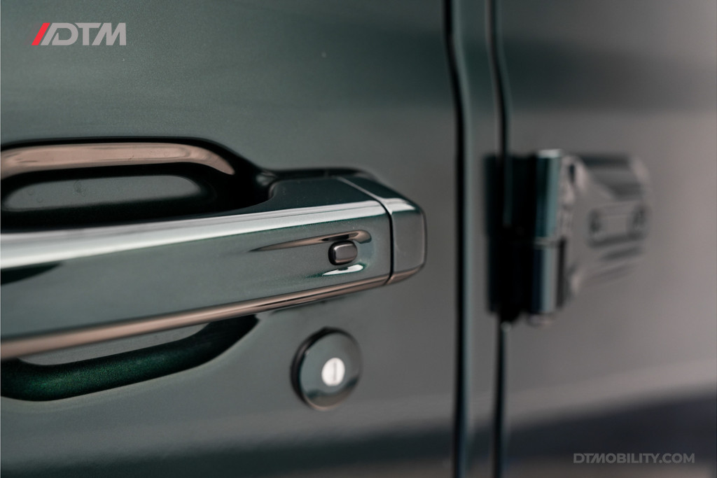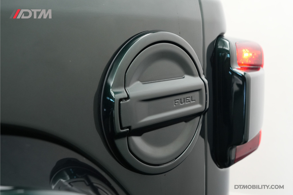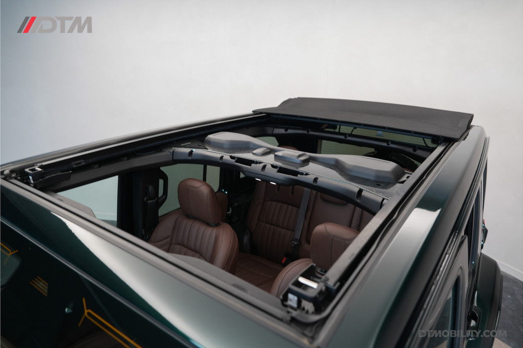 De eerste aanblik laat geen ruimte voor twijfel: dit is pure klasse. De carrosserie is volledig uitgevoerd in de iconische Porsche-kleur Emerald Green (Paint to Sample). Deze diepe, rijke groentint geeft de Jeep een tijdloze elegantie, tot in de kleinste details doorgevoerd (inclusief de instaplijsten en binnenzijde van de stijlen).